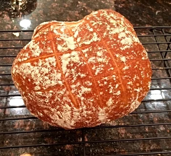 6. Using a serrated knife, slash top of dough in three parallel, 1/4-inch deep cuts (or in a tic-tac-toe pattern). Slide dough onto preheated baking stone. Pour 1 cup hot tap water into broiler pan and quickly close oven door to trap steam. Bake until crust is well-browned and firm to the touch, about 30 minutes. Remove from oven to a wire rack and cool completely.